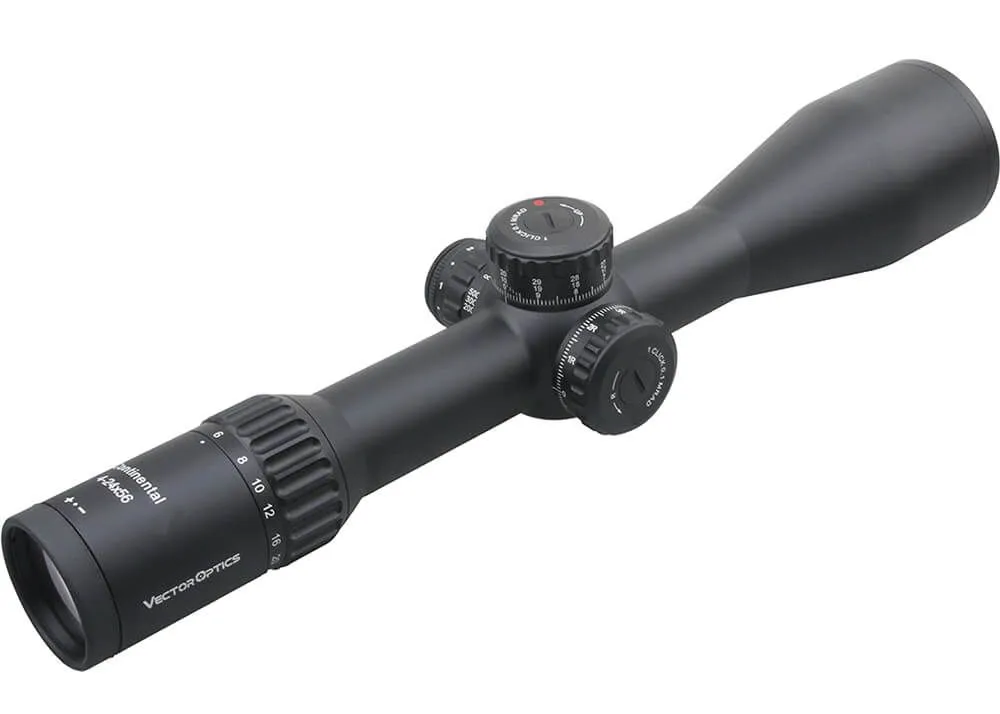 Deze Vector Optics Continental 4-24×56 richtkijker heeft een flink objectief met een diameter van maar liefst 56 mm. Hierdoor ben je verzekerd van een uitmuntende lichtdoorlaat, waar alleen maar aan wordt bijgedragen door de fully multi-coated lenzen van German Schott. Zij zorgen ervoor dat het licht volledig door de richtkijker gaat. Hierdoor heb je -ook bij weinig licht- een zeer helder, scherp en gedetailleerd beeld. De richtkijker heeft een vergroting van 4 tot 24 keer, waarmee je lekker dichtbij het doelwit kunt komen. Het oculair heeft een diameter van 42 mm en hij heeft een veilige oogstand van 100 mm. Hierdoor kun je hem comfortabel gebruiken met krachtige lange afstand geweren, waar de Vector Optics Continental 4-24×56 richtkijker ook voor bedoeld is.